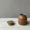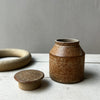 En liten drejad burk i blandlera och blåglå glasyr med avtagbart lock. Den mjukt spräckliga ytan i varma, jordnära toner ger ett lugnt och naturligt uttryck samtidigt som det visar lerans karaktär.
