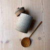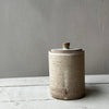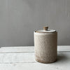 En drejad burk i bandlera med lock som har en liten facetterad knopp. Burken är glaserad i en vitmatt glasyr som fint visar lerans karaktär.